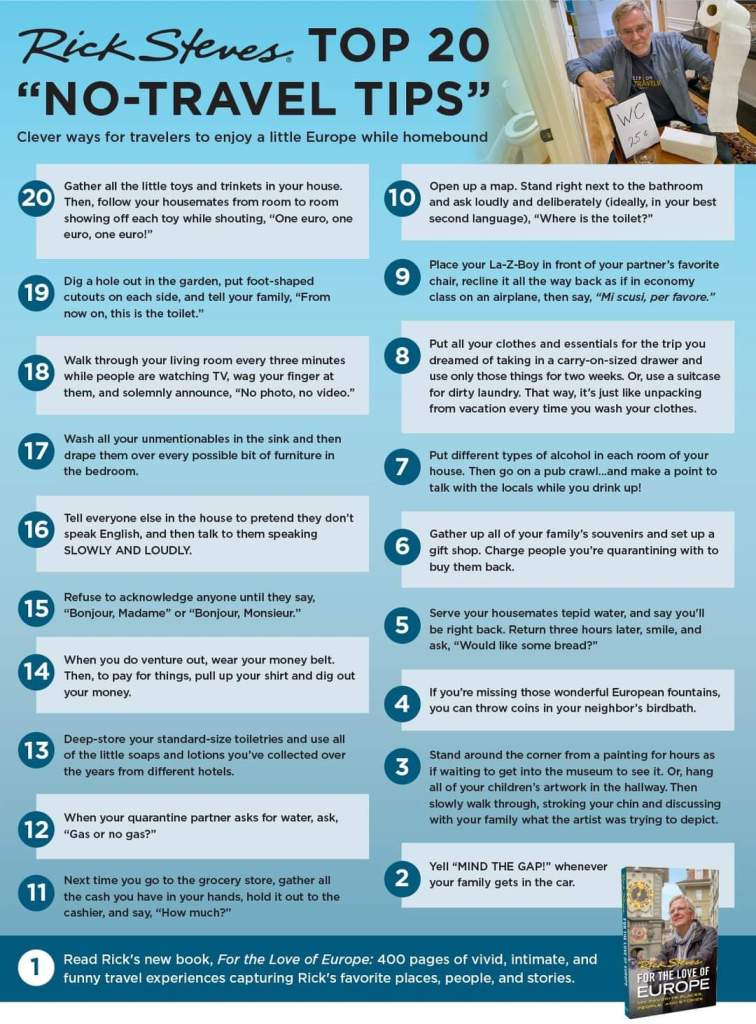 I saw this online recently and thought it was pretty funny. Since we’re still stuck at home, we can follow some of Rick Steves’ tips to pretend we’re on a trip. Which one is your favorite?