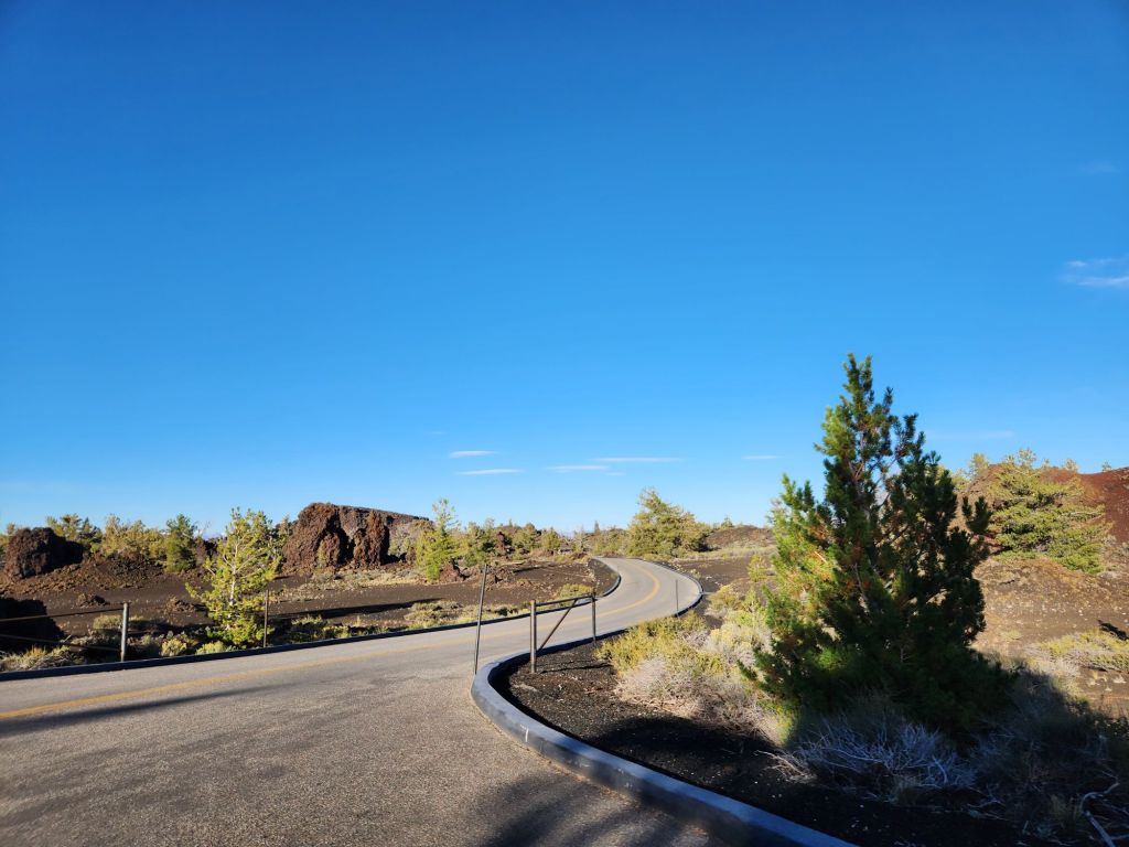 Visitors can explore miles of trails, caves, and scenic byways along the park’s 9-mile loop road. We saw plenty of RVs and folks at the campsites. There is a small Visitors Center as well, but it was already closed by the time we got there that day. We did the loop drive and walked along a paved trail through one of the main lava fields.