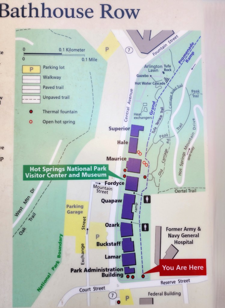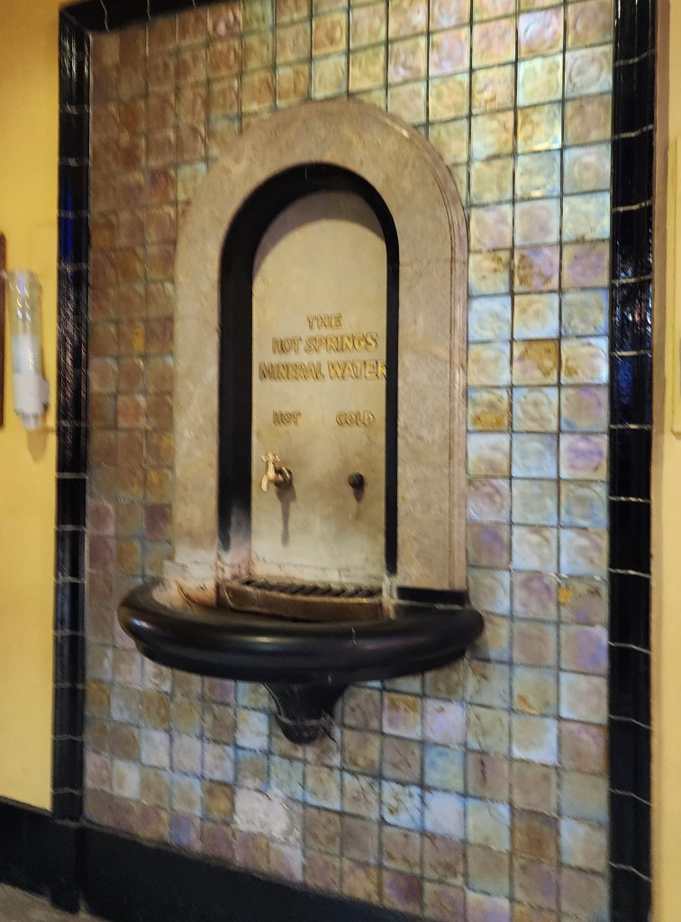 We made our way to Bath House Row, one of the key spots within Hot Springs National Park, where a string of bathhouses from the past still stand. Only two are still functioning as bathhouses, though. The rest have been converted into restaurants and other buildings, including the Visitors Center. They’re all still beautiful buildings.