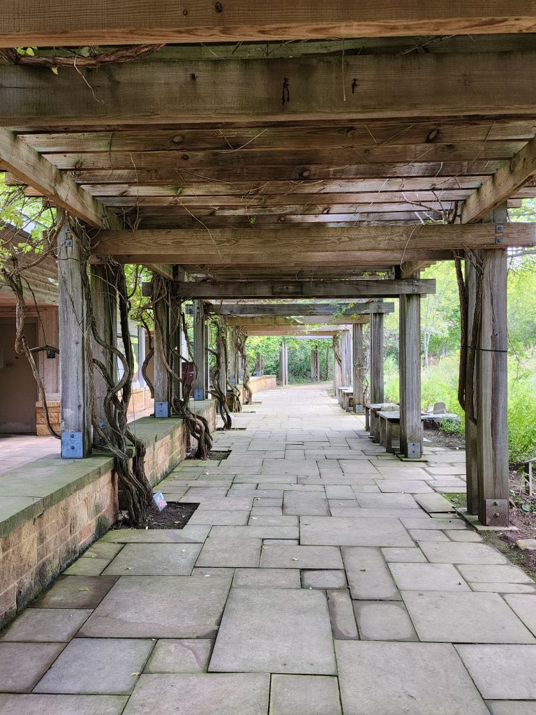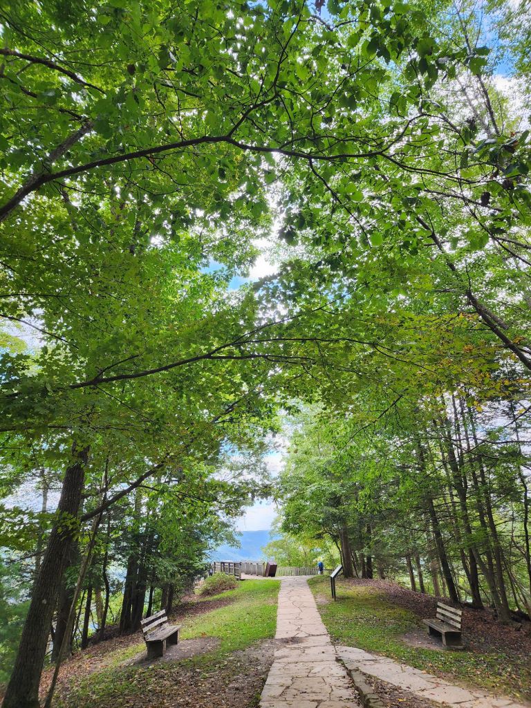 At 1400 feet above the river, we got a beautiful panoramic view of a horseshoe shaped bend in the river and one of the deepest parts of the gorge. From the parking lot, it is a short flat walk to a wooden viewpoint platform. There are picnic areas and trailheads off this path for longer hikes deeper into the woods too.