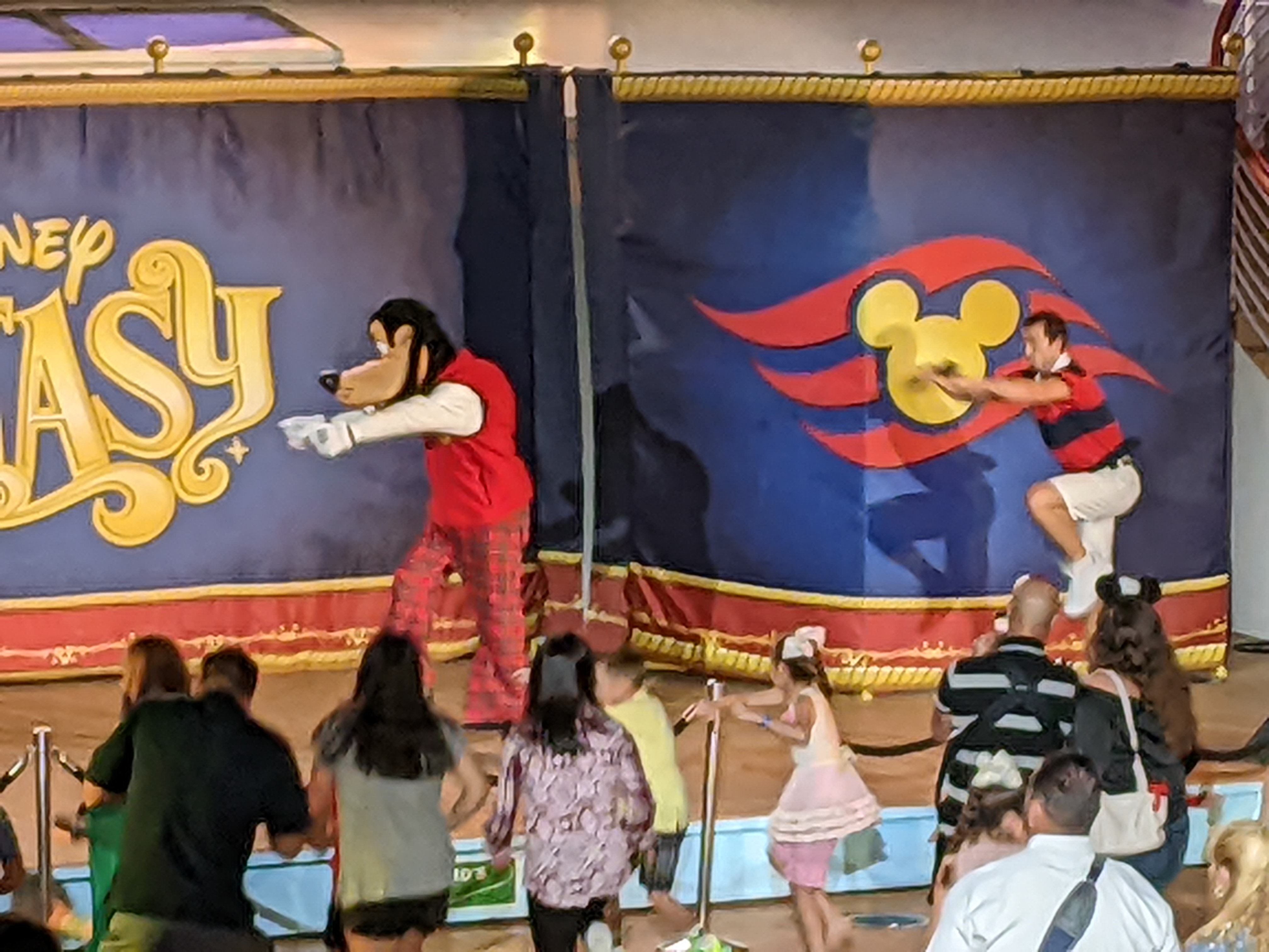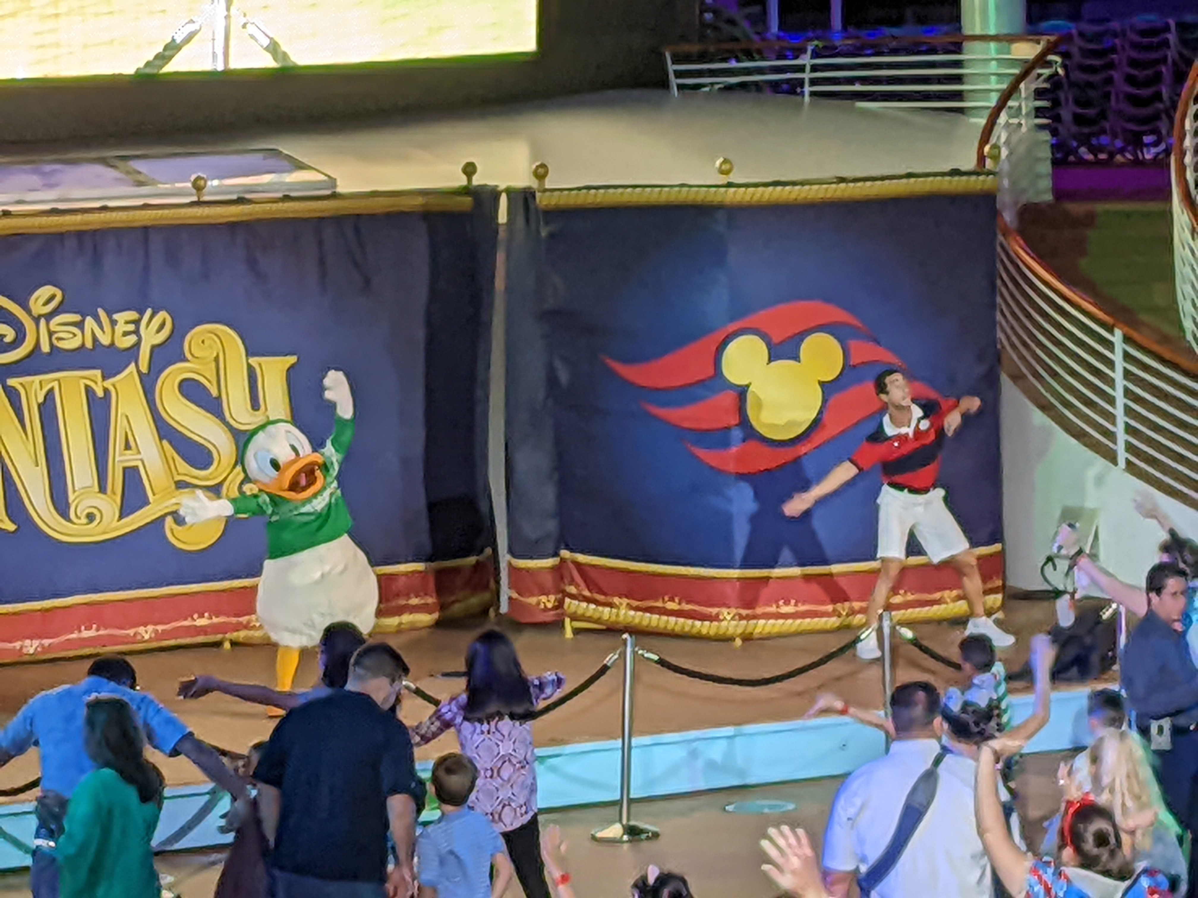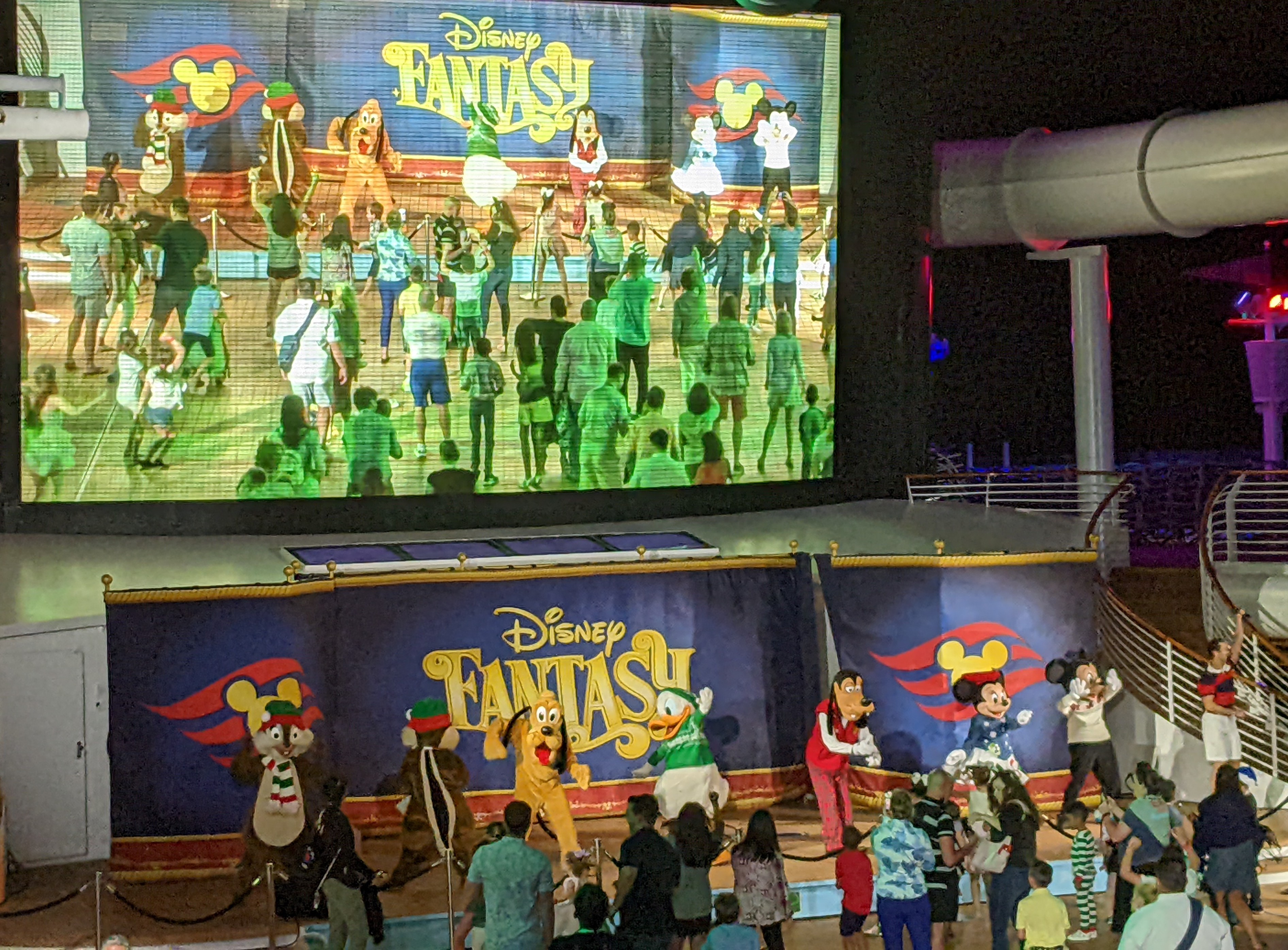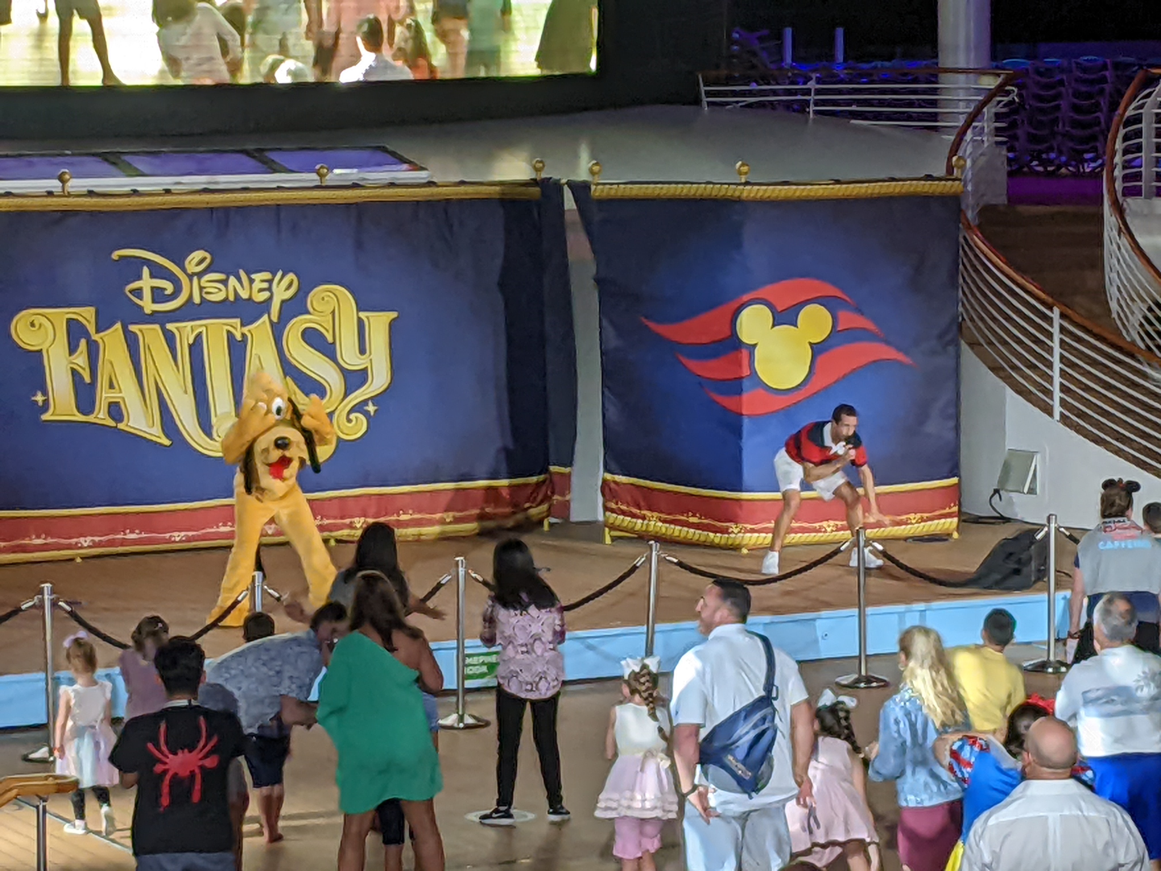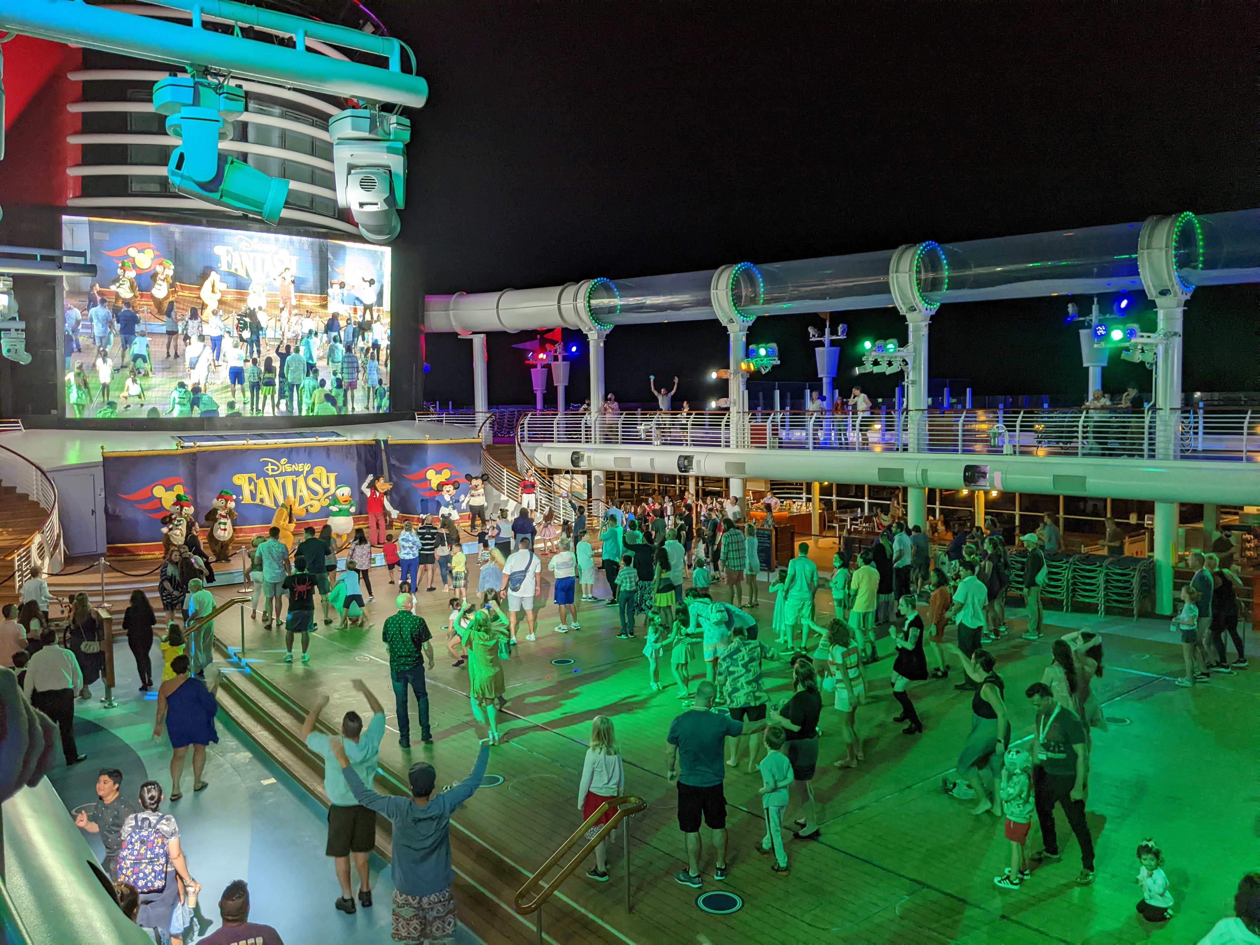 Then, a little before dinner, they had another dance party up on the top deck where alot of the characters came out for a little dancing fun.