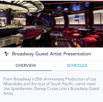 My biggest advice, look out for events like this on your next cruise and definitely go! And please also give your feedback to Disney to feature things like this more! Support my cause! LOL! I always tell people that the cruise shows are amazing and one of the biggest reasons we sail Disney. They need to tout the fact that they also have Broadway actors in them, though all of the cast members are great too and can also be on Broadway. Make sure you don’t miss the shows!