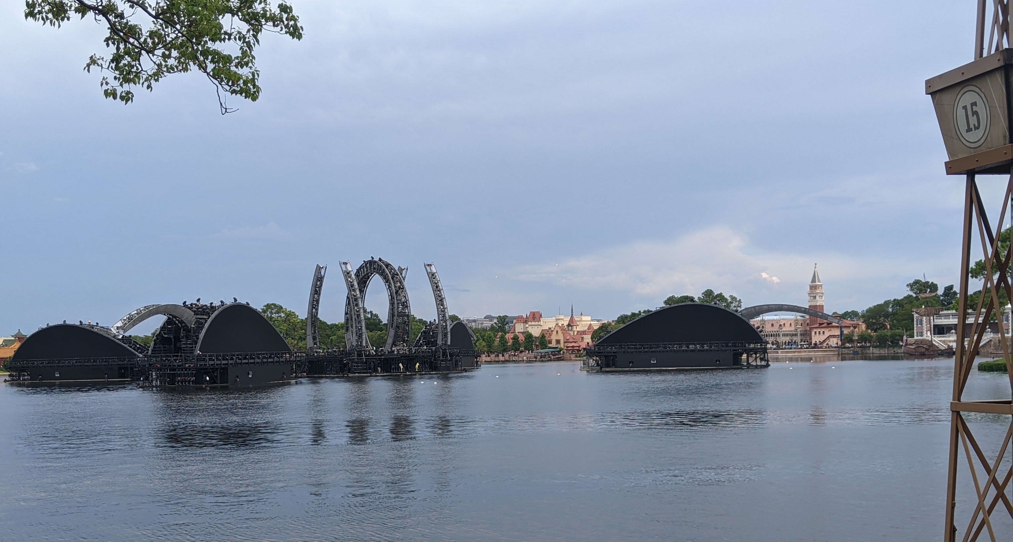 As we started walking around, a sudden hurricane blew in! Well, maybe it didn’t officially register as a hurricane, but it sure felt like one! Afternoon storms are pretty common this time of year in Florida, so we knew they were possibilities and had our ponchos, but this one just started with no warning. It didn’t even do the thing where it started drizzling gradually for a bit before turning into full rain. It just all of a sudden turned dark and a heavy downpour started with strong winds and the loudest cracks of thunder and lightning I’ve ever heard. It felt like they were right over us. We ducked into the overhang covers in the America pavilion building when it started.