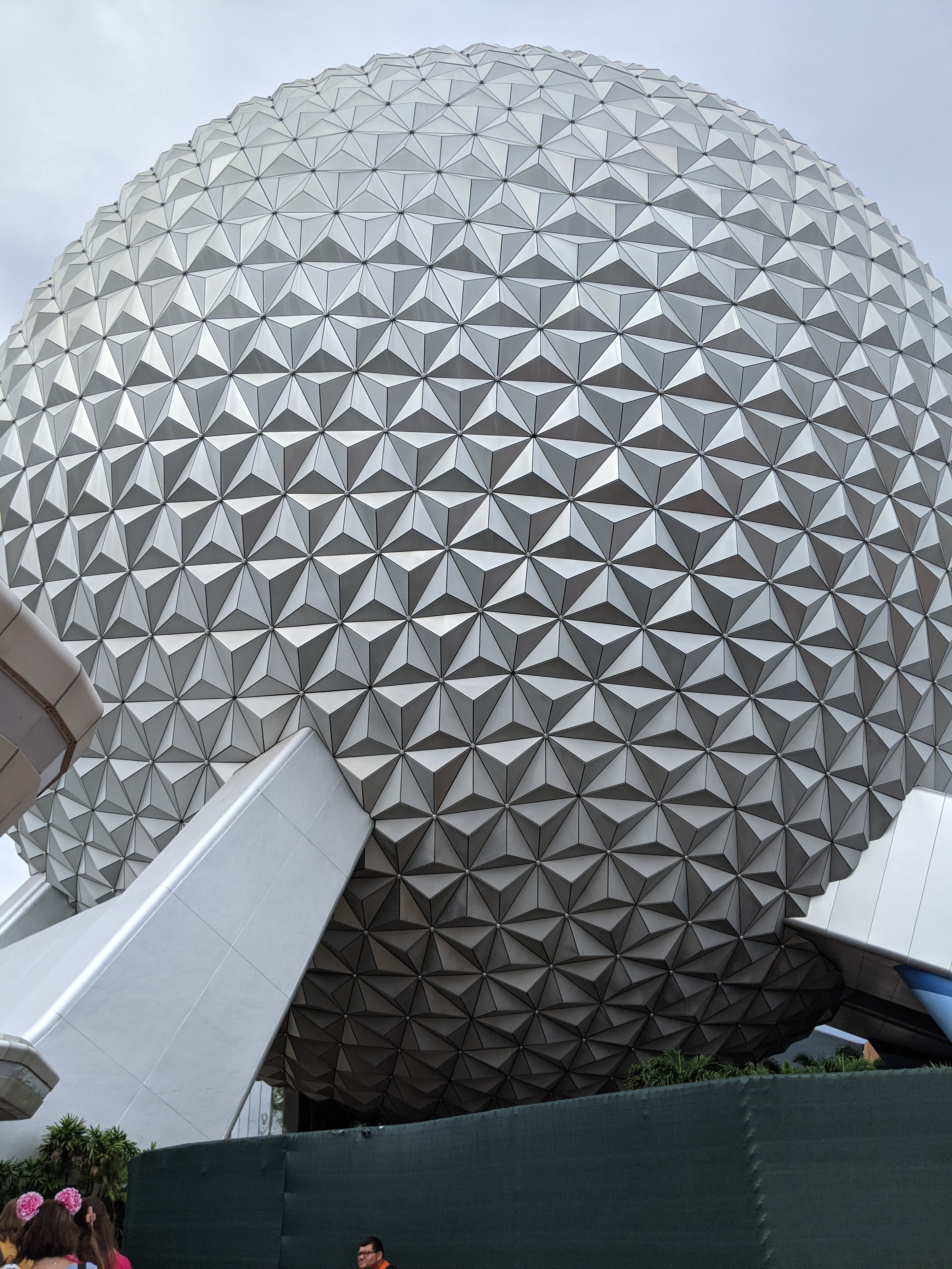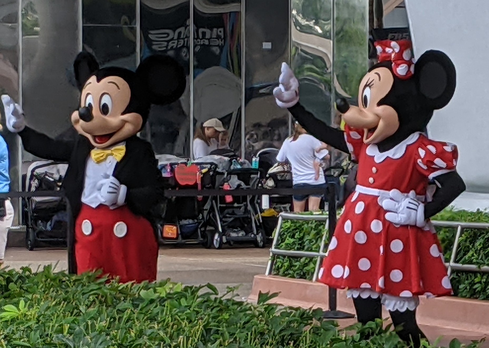 This was actually the first time this trip that we entered EPCOT at the front entrance since that’s where the buses drop off. The past few times, we’ve taken the Skyliner and that drops off at the back entrance by France. So, of course, we had to take the obligatory pictures in front of the Spaceship Earth ball. Mickey n Minnie we’re also out waving to everyone!
