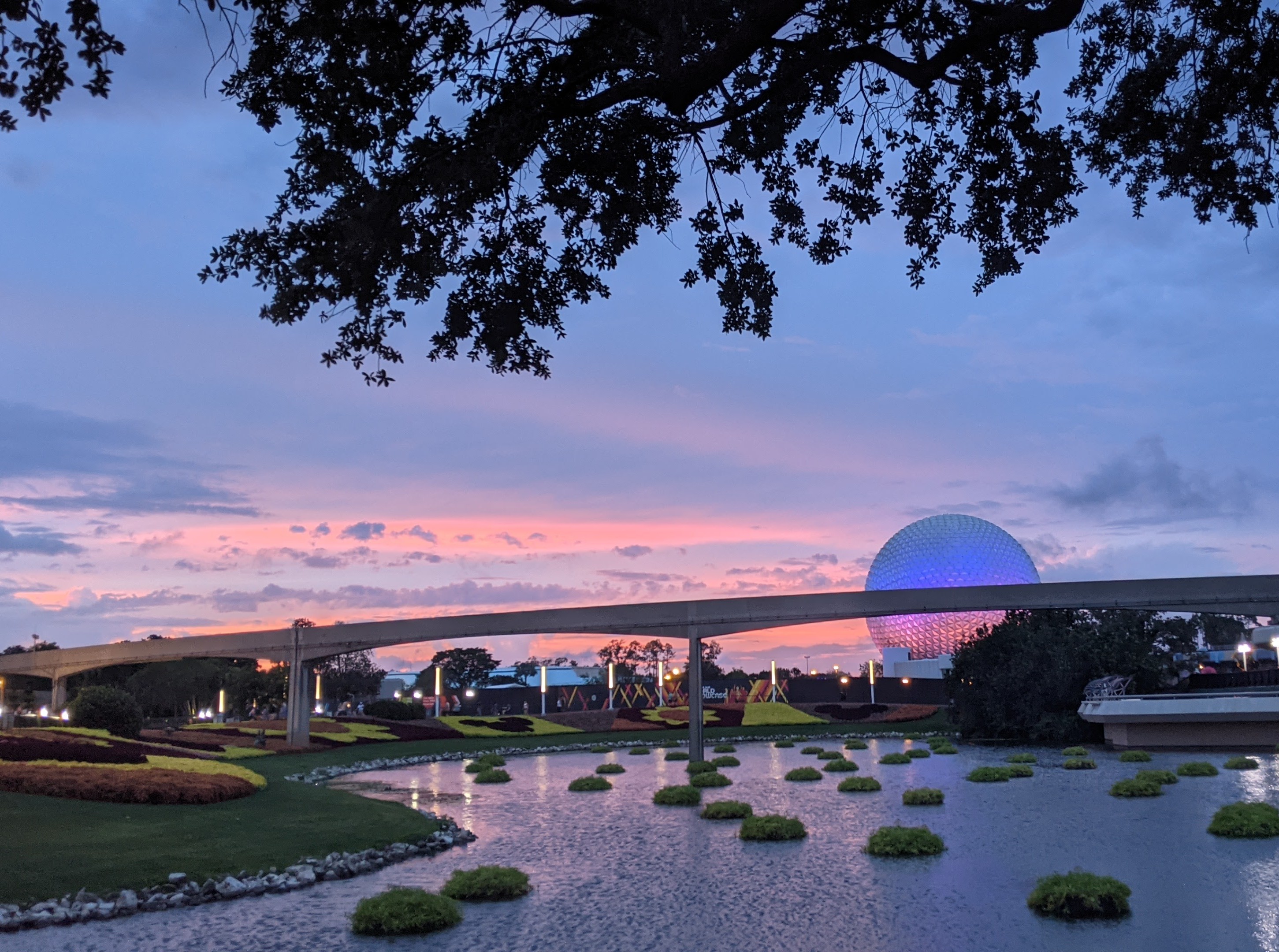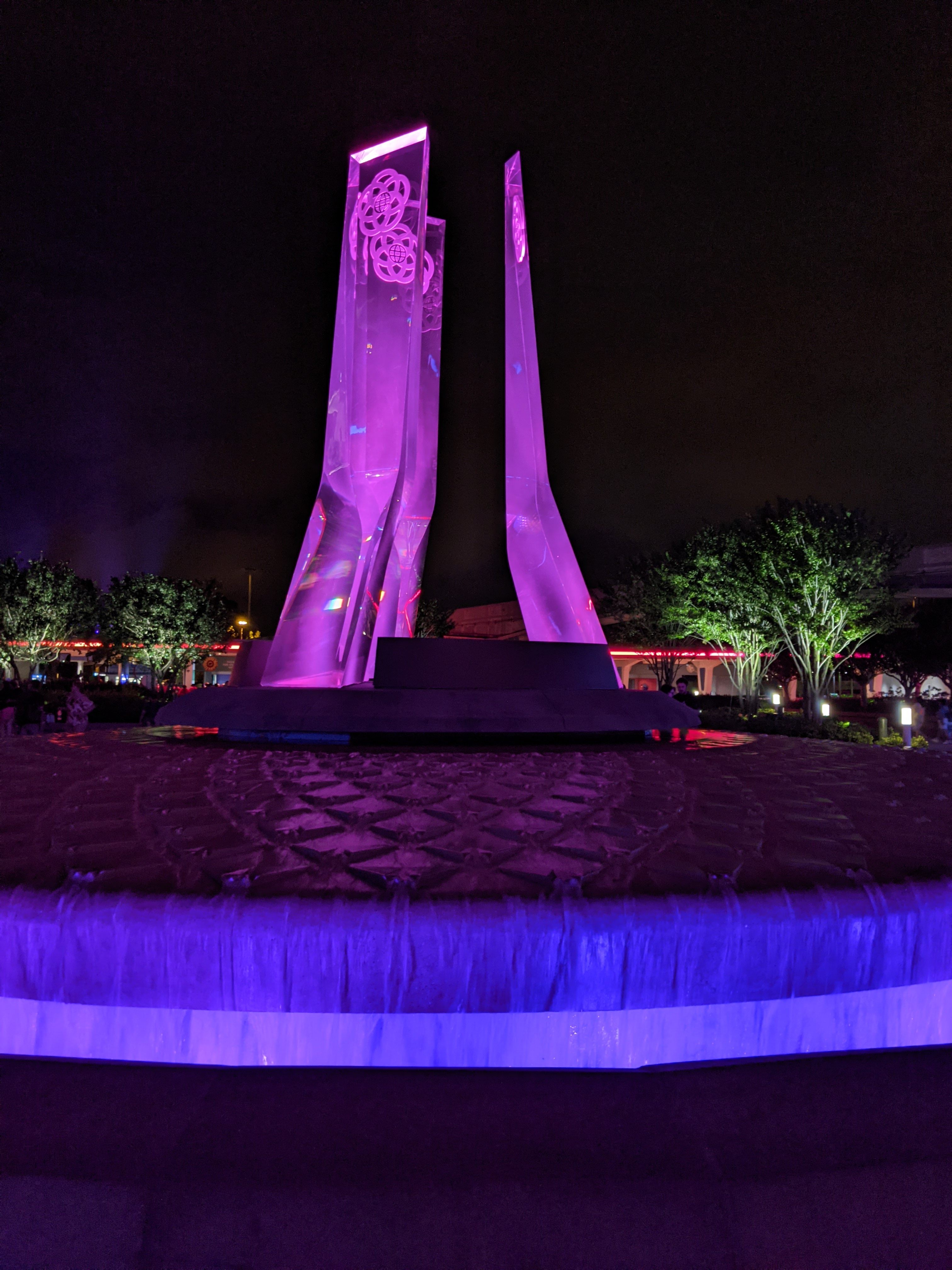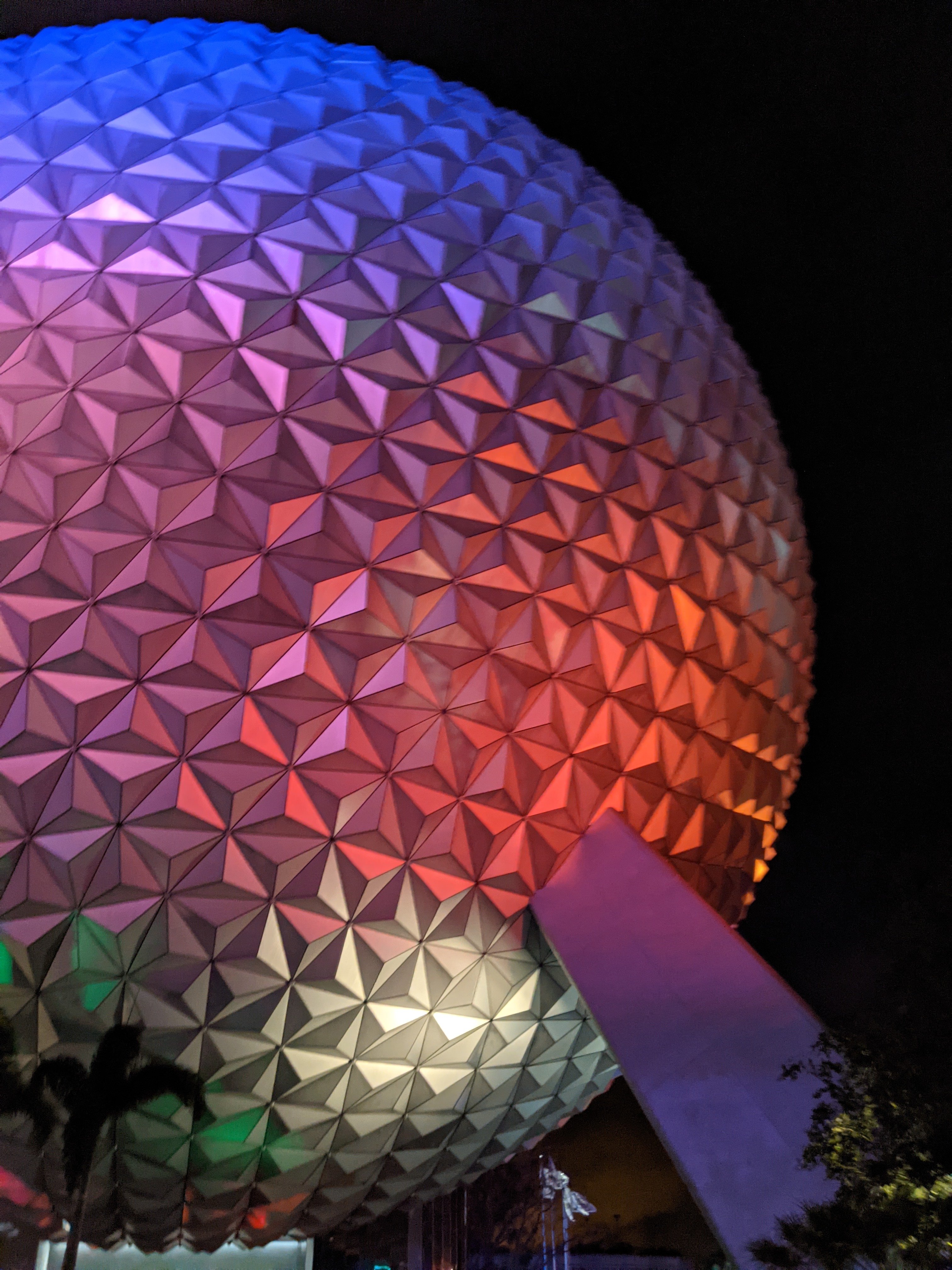 It was fun to leisurely explore EPCOT in the evening, with very low crowds, after the jammed-packed day at Magic Kingdom. Of course, we had to end it with some more pics of the Spaceship Earth ball all beautifully lit up, before heading to the Skyliner back to Pop. They unveiled the retro fountain in front of it not too long ago too, so it was our first time seeing it lit up like this. The entire front of the park was renovated recently, and it’s beautiful!