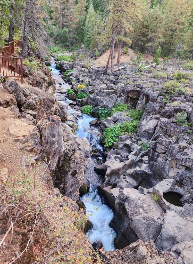 Next, we drive over to McCloud Falls, not far from Burney Falls. McCloud Falls is another iconic Northern California waterfall system. It actually consists of three falls along the McCloud River – Lower, Middle, and Upper Falls. They’re only a few minutes drive apart, each with its own parking lot, hiking trail head, and scenic viewpoint that is easy to walk to from each lot, so you can visit any of them separately. However, if you’re ambitious, you can try to hike to all of them from one end to the other. We just drove this time.