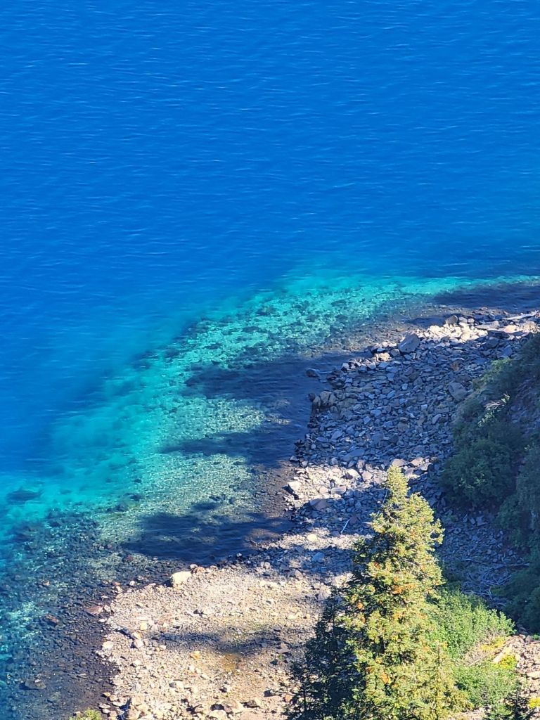 To say the lake is stunning is even an understatement. Walking to the overlook behind the Visitor’s Center, we caught our first glimpse of the brightest, bluest water we’ve ever seen! It was a perfectly still, almost glass-like, huge round lake. These pictures don’t even do it justice. It was amazing!