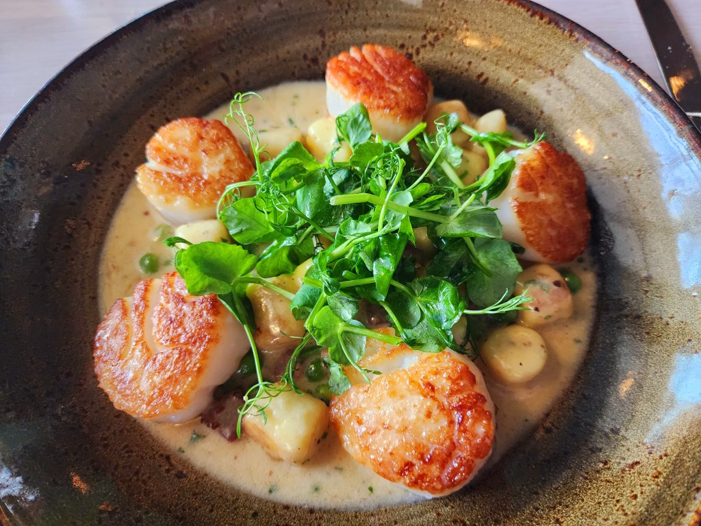 Anyway, besides Tron, we rode some of the old favorites around the park before heading out for a new-to-us dinner at Narcoosees at the Grand Floridian Resort. It is considered a Disney signature restaurant, so a little swanky but not at all stuffy or anything. Our server was very friendly, and we got a table by the window with a view of the Cinderella Castle! The menu is more seafood based but there were some non-seafood options too. We got the scallop and salmon entrees, along with appetizers and dessert, and everything was delicious!